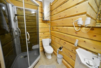 Стандарт: это либо однокомнатный номер в бревенчатом шестиквартирном доме (спальня, туалетная комната с душевой кабиной, мебель и бытовая техника) либо летний однокомнатный номер, в отдельно стоящем бревенчатом доме (двуспальная или 2 односпальные кровати, туалетная комната с душевой кабиной, бытовая техника).