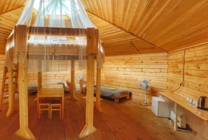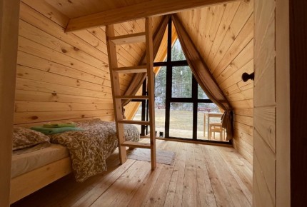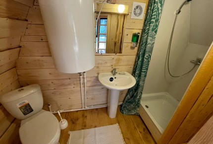 | 3-х местный благоустроенный домик с панорамным окном | Душ, унитаз, раковина, электрочайник, одна кровать двуспальная на втором ярусе, одна кровать одноместная на полу, обогреватель, на веранде стол и табуретки |