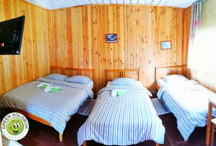 | 4-х местный домик | 2 односпальные кровати, одна двуспальная, Wi-Fi, телевизор, умывальник, унитаз, обогреватель, электрочайник, стеллажи, стол на веранде |