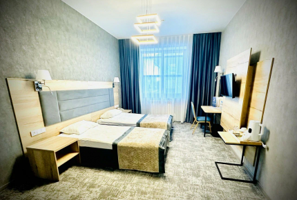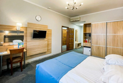 26 кв.м, до 2 человек. Просторная двуспальная кровать и раскладной диван-кровать. Телевизор с плоским экраном и кабельным телевидением. Кондиционер и затемняющие шторы для комфортной температуры и сна. Высокоскоростной Wi-Fi и телефон для связи. Рабочее место: письменный стол, кресла, хорошее освещение. Гардеробная зона: вешалки-плечики, шкаф-купе, тумбы. Чайный набор: электрический чайник, чашки, чай/кофе. Ванная комната: душевая кабина, раковина, санузел. Банные принадлежности: полотенца, мыло, фен, тапочки, халаты, гигиенические средства, косметическое зеркало. Услуги: ежедневная уборка номера, обслуживание в номер, услуги прачечной (платно). Покрытие пола: мягкий ковролин для дополнительного уюта. Номер для некурящих.