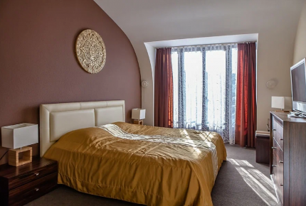 70 кв.м, 6 человек. Просторные апартаменты с двумя комнатами: спальня и гостиная. Собственная сауна в номере для релакса в любое время. Панорамные окна с видом на горы Алтая. Просторная двуспальная кровать и раскладной диван-кровать. Два телевизора с плоским экраном и кабельными каналами. Кондиционер и затемняющие шторы для идеальной атмосферы. Высокоскоростной Wi-Fi и телефон для связи. Рабочая зона: письменный стол, кресла, настольные лампы. Гардеробная комната: шкаф-купе, тумбы, вешалки-плечики. Чайный набор: электрический чайник, чашки, чай/кофе. Мини-бар (платно). Ванная комната: ванна, биде, раковина, санузел. Банные принадлежности: полотенца, халаты, тапочки, мыло, гигиенические средства, фен, косметическое зеркало. Ежедневная уборка номера, обслуживание в номер, услуги прачечной (платно). Покрытие пола: мягкий ковролин для тишины и уюта. Сейф и электронные замки для безопасности. Номер для некурящих