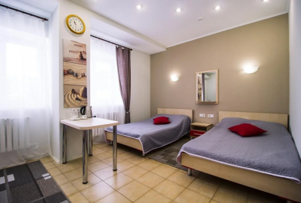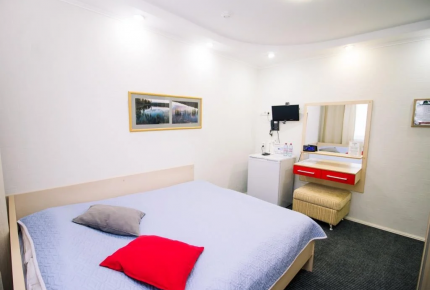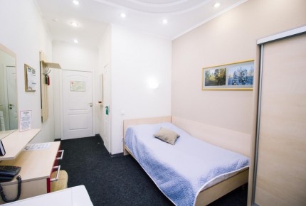Стандарт одноместный: однокомнатный номер совмещенный санузел (душ), кровать- «полуторка», тумбочка, полка-зеркало, холодильник (мини), телевизор, телефон (внутренняя связь), мини-бар, чайник, набор посуды, фен)