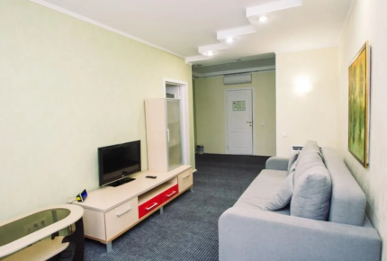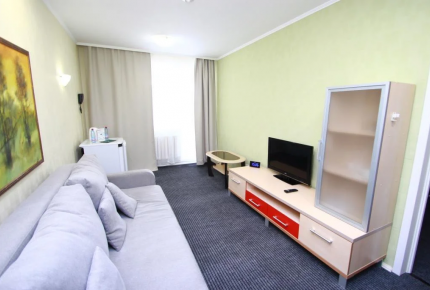Двухкомнатный люкс: двухкомнатный номер (три основных места), совмещенный санузел (ванна), балкон. Спальня (двуспальная кровать, шкаф-купе (зеркало), прикроватная тумбочка – 2 шт., полка- зеркало, пуфик). Гостиная (диван (раскладывающийся), кресло, телевизор, холодильник (мини), телефон (внутренняя связь), встроенный шкаф-купе, мини-бар, чайник, набор посуды, кондиционер, стенка под ТВ аппаратуру, фен)