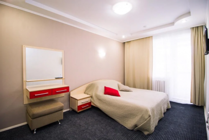 Стандарт двухместный: однокомнатный номер, совмещенный санузел (ванна), балкон, двуспальная кровать, прикроватная тумбочка, полка – зеркало, телевизор, холодильник, телефон (внутренняя связь), встроенный шкаф-купе, мини-бар, чайник, набор посуды, фен)