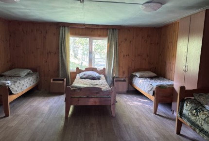 Двухэтажный дом из бруса. На первом этаже 3 комнаты с общей кухней и печкой. Во всех комнатах индивидуальные тумбочки. А также на первом этаже имеется санузел (унитаз и умывальник). На втором этаже (мансарда) 2-местные две летние комнаты с односпальными кроватями. Возможно дополнительное место (раскладушка) — 500 ₽. |