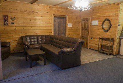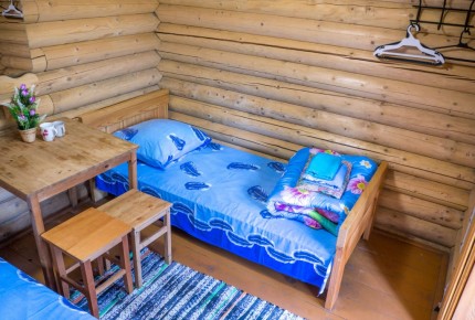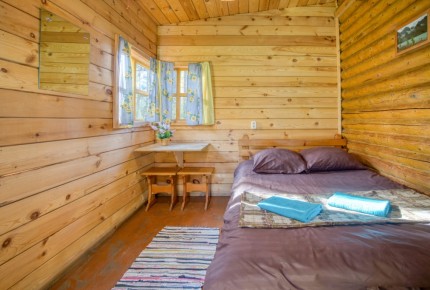 Размещение в коттедже: двухэтажный коттедж из кедра с двухместными номерами с удобствами на улице и с балконами. В номере: две односпальные кровати, тумбочка, зеркало, стол со стулом, вешалка для одежды возле входа. Возможное размещение: 2 осн. + 1 доп место).