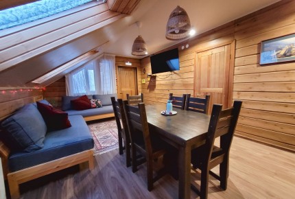 Две спальные комнаты. В спальных комнатах: 2-спальная и 1,5-спальная кровати, светильники, розетки, тумбочки, вешалки, деревянный пол. В гостиной: диван (раскладывается), телевизор, светильники, розетки. В кухонном пространстве: кухонная мебель, деревянные обеденный стол, стулья, лавки; холодильник, чайник, плитка 2-комфорочная, набор посуды. Туалетная комната с душем за стеклянной стенкой, унитазом, раковиной, теплый пол, покрытый плиткой. Прихожая: вешалка, подставка под обувь, теплый пол, покрытый плиткой.