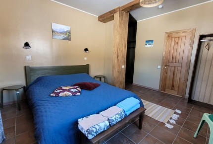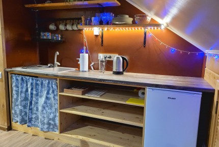 Два домика. В каждом — одна 2-местная комната. В комнате – 2 кровати (можно сдвинуть), место для вещей, столик, светильники, розетки. Туалеты и умывальники - на территории.