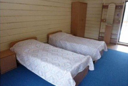 Оснащён двуспальным диваном, шкаф для верхней одежды, стол (или тумба) под TV, стулья, холодильник, телевизор. Туалетная комната: душевая кабина, WC, раковина, зеркало, на каждого гостя комплект белых махровых полотенец (3 шт). |