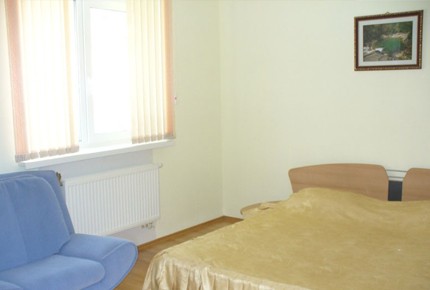 Люкс (№2) – однокомнатный, 35 м2. В номере: 2-спальная кровать, шкаф, комод, тумбочка, ТВ, диван-уголок, кресло, стол, стулья, холодильник. Туалетная комната: санузел, раковина, душевая кабина. 2 осн. места + 2 доп. места.