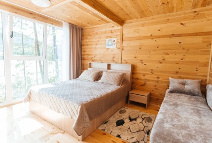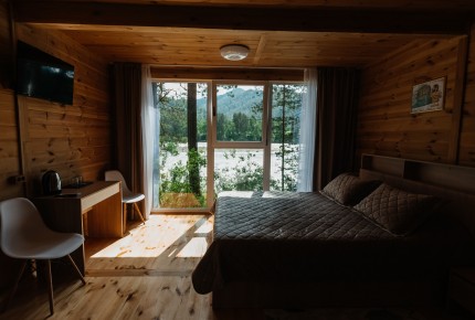 Однокомнатный дом с витражными окнами. Площадь номера - 21 кв.м. В доме: двуспальная кровать, односпальный диван, стол и два стула, телевизор, шкаф, холодильник, халаты на двух гостей, тапочки, чайник и набор посуды. Санузел: ванна, фен, раковина, туалетные принадлежности.