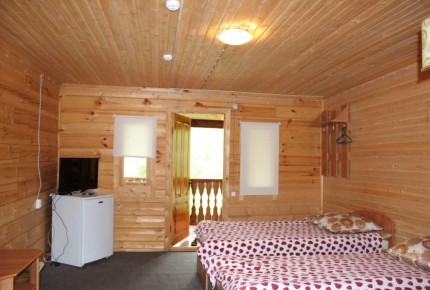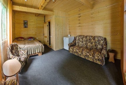 Однокомнатный - 24 м2: двуспальная кровать, раскладной диван, зеркало, TВ, ковер на полу, тумбочки, холодильник. Туалет в номере, душ на территории.