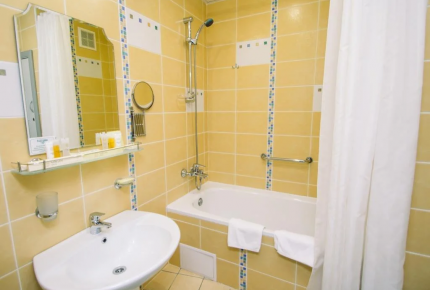 Стандарт двухместный: однокомнатный номер, совмещенный санузел (ванна), балкон, двуспальная кровать, прикроватная тумбочка, полка – зеркало, телевизор, холодильник, телефон (внутренняя связь), встроенный шкаф-купе, мини-бар, чайник, набор посуды, фен)