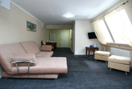 Двухкомнатный люкс: двухкомнатный номер (три основных места), совмещенный санузел (ванна), балкон. Спальня (двуспальная кровать, шкаф-купе (зеркало), прикроватная тумбочка – 2 шт., полка- зеркало, пуфик). Гостиная (диван (раскладывающийся), кресло, телевизор, холодильник (мини), телефон (внутренняя связь), встроенный шкаф-купе, мини-бар, чайник, набор посуды, кондиционер, стенка под ТВ аппаратуру, фен)