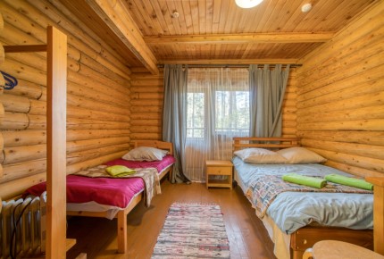 Размещение в коттедже: двухэтажный коттедж из кедра с двухместными номерами с удобствами на улице и с балконами. В номере: две односпальные кровати, тумбочка, зеркало, стол со стулом, вешалка для одежды возле входа. Возможное размещение: 2 осн. + 1 доп место).