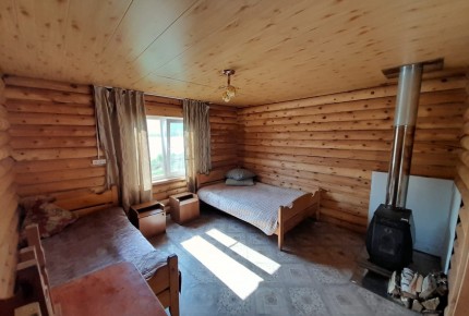 Теплый дом из бруса и с печкой. А также имеется небольшая веранда. В доме имеются 4 односпальные кровати, шкаф, стол и стулья. Санузел (умывальник, унитаз) на веранде. |