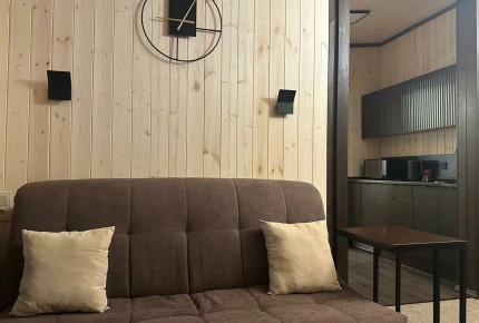 Отдельно стоящий коттедж из кедрового бруса с большой верандой. Возможно круглогодичное проживание. Внутри: одна односпальная кровать с пружинным матрацем, одна двуспальная кровать с пружинным матрацем, журнальный столик, холодильник, телевизор, тумбочки, зеркало, полка под косметические принадлежности. Туалетная комната: WC, раковина (горячая вода). На веранде: лавочки, вечернее освещение. 2 основных места + 1 дополнительное (на двуспальной кровати). |