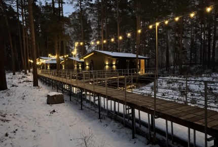 Домики “эконом-класса” – небольшие деревянные летние домики и стационарные палатки (“палатки” на 4 места и “шатер” на 2 места) Оборудованные костровища рядом с водой, беседки и деревянные трапы с парковым освещением для прогулок в любое время суток.