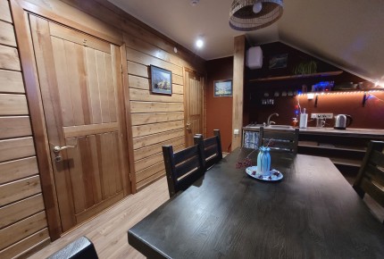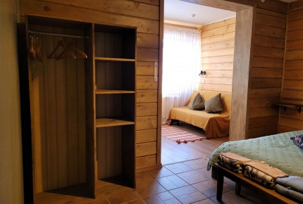 1-й этаж: одна 2-местная комната, две 3-местных комнаты, одна 4-местная комната. В комнатах – кровати, шкафы, тумбочки, светильники, розетки. Этаж отапливается печкой в холодные летние дни.