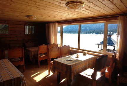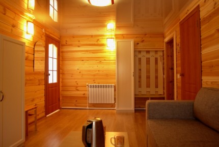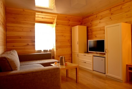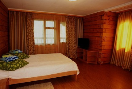 Студия. Большая комната студия с лоджией видом на озеро. Находится над баней, на втором этаже. В номере одна 2-ух спальная кровать, 2 тумбочки прикроватные, диван-книжка (евро), шкаф, обеденный стол, 4 стула, холодильник, электрический чайник. Туалетная комната: раковина, душевая кабина, унитаз. |